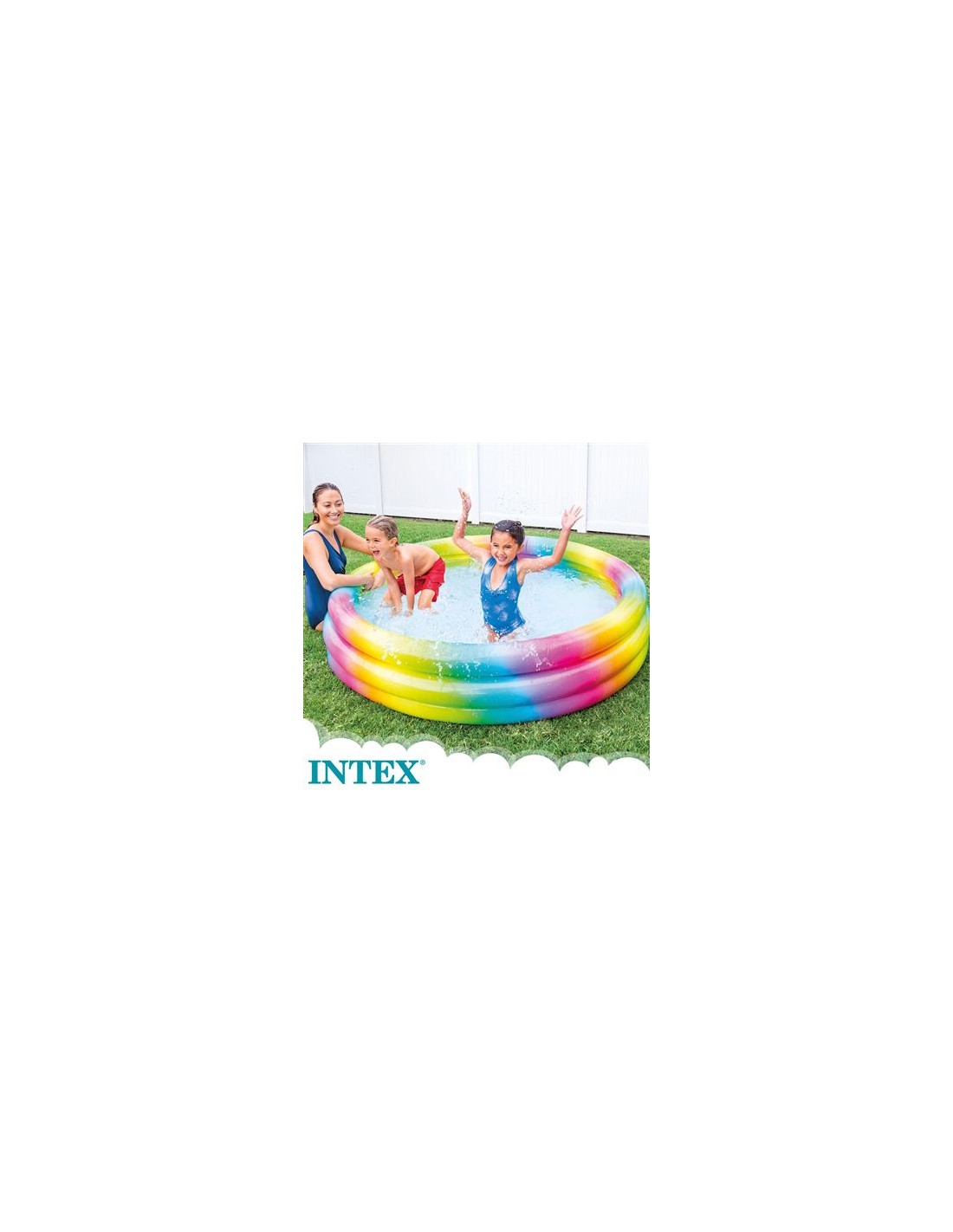 Piscina inflable de tres cèrcols amb els bonics colors de l'arc de Sant Martí, amb capacitat per a 581 litres.