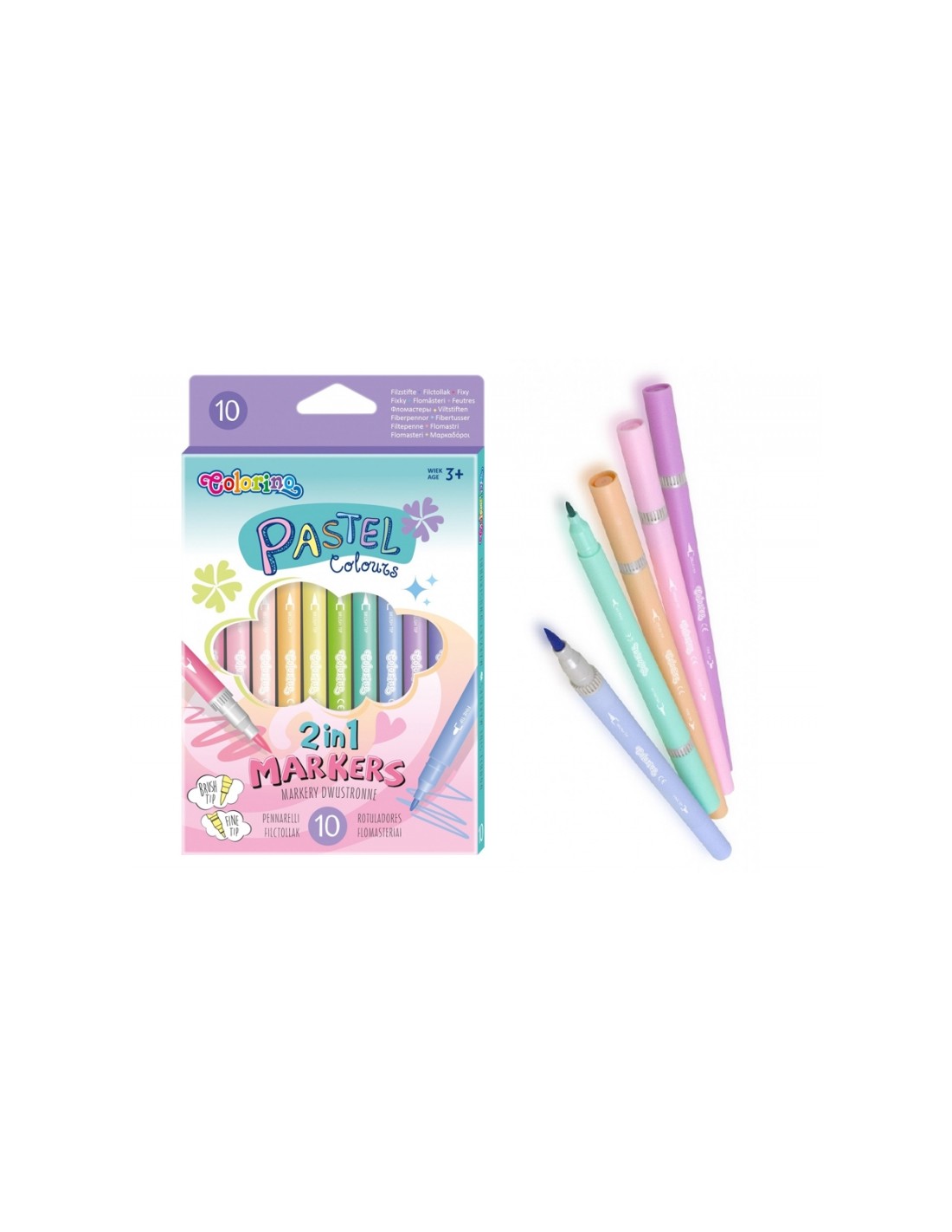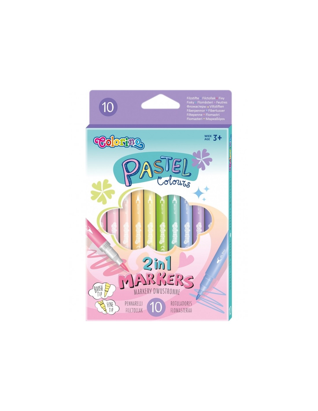 Estoig de 10 retoladors amb dues puntes, punta de pinzell i punta fina. De 10 colors diferents en tons pastel. En caixa de cartró. A partir de 3 anys.