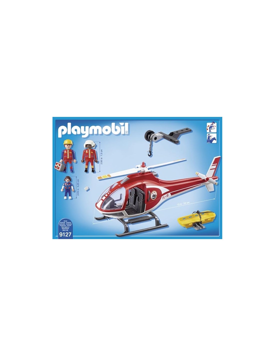 Helicòpter de rescat amb llitera de rescat i hèlixs giratòries. Inclou 3 figures: el pilot, el sanitari i un nen. A partir de 4 anys. Playmobil 2017.