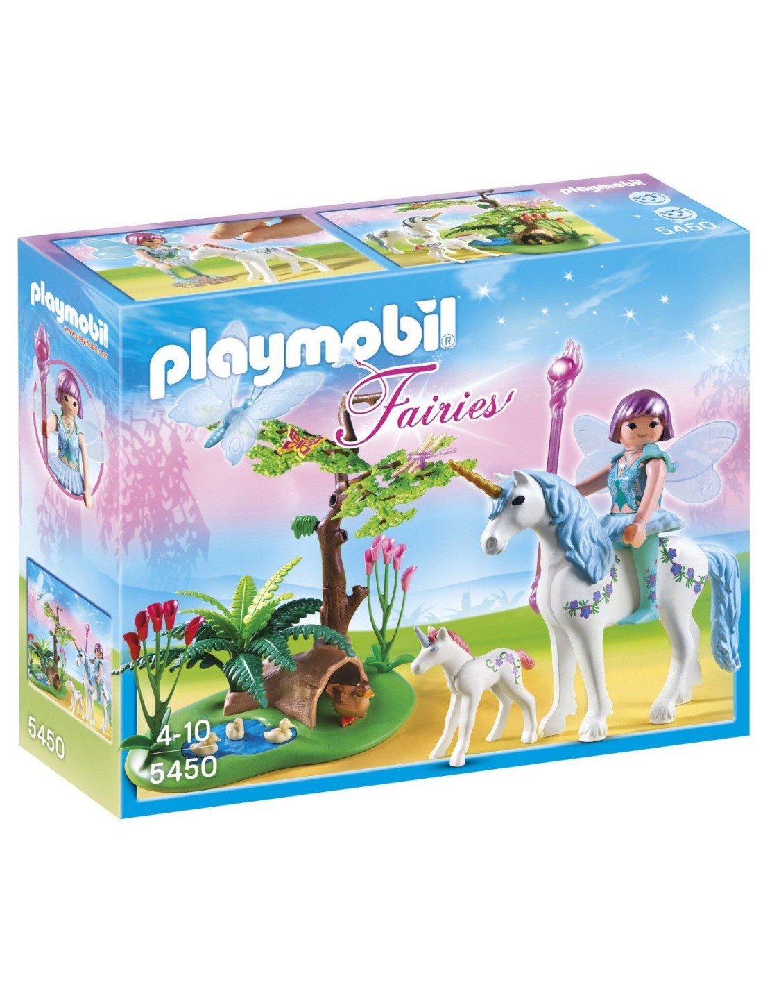 Conjunt de fada alada amb dos unicorns (un adult i una cria) i petita porció de prat amb llac, vegetació, una família d'ànecs dues papallones i una libèl·lula. A partir de 4 anys. Playmobil 2012.