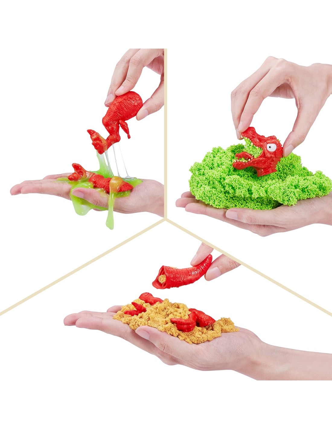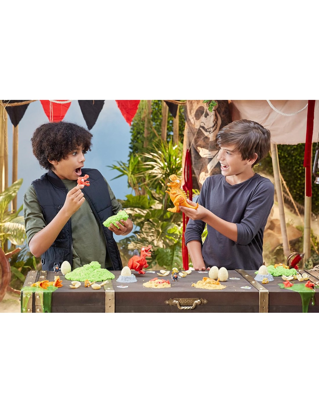 Contingut: 1x ou dino gran, 1x dinosaure (parts desarmades per acoblar, cos que brilla), 1x figura de pirata, 1x calavera daurada, 1x mapa rasca i guanya del tresor, 1x sorra cinètica líquida dino, 1x slime dino, 1x escuma dino, 1x full enganxines, 4xmini ous, 4x mini dinosaures, 1x base, 1x manual,