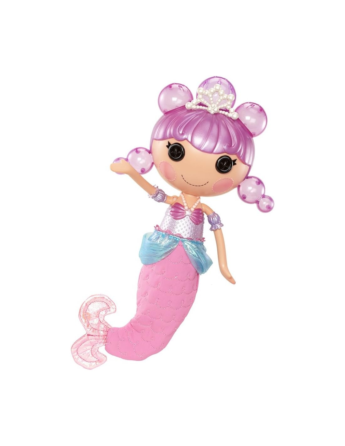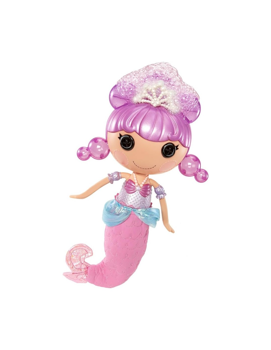 Nina Lalaloopsy marina. En pressionar-la crees molts pentinats de bombolles. Amb la seva mascota i recipient per a la solució sabonosa reutilitzable. A partir de 4 anys.