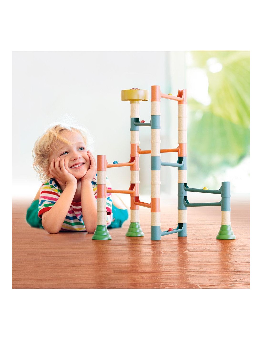 Aprende las leyes de la gravedad construyendo un chulísimo circuito para canicas con 108 piezas de colores naturales como los de la jungla..