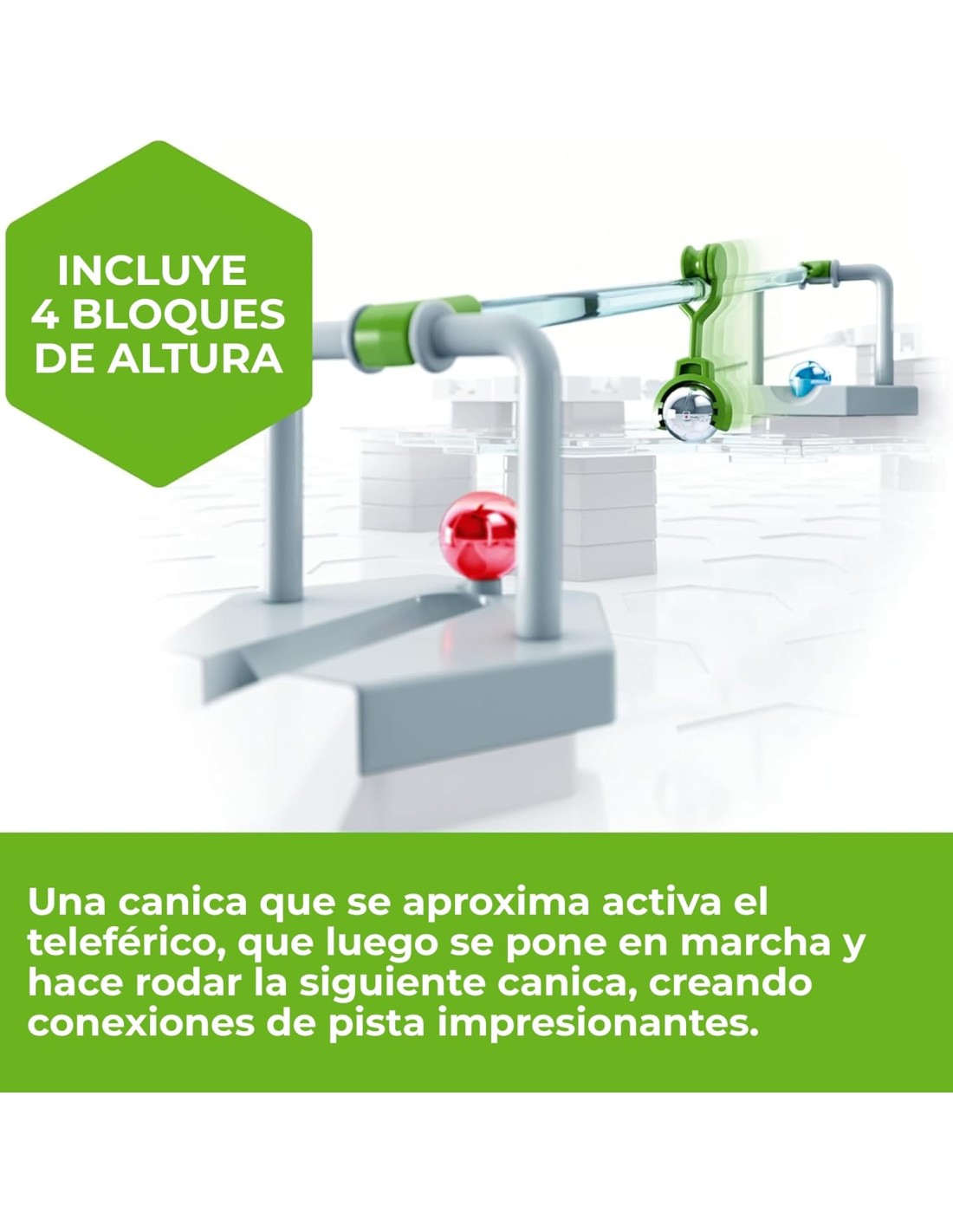 Incluye: Instrucciones en varios idiomas, 1 módulo de acción teleférico, 1 riel de plástico largo, 2 rieles de plástico medianos, 3 rieles de plástico cortos.