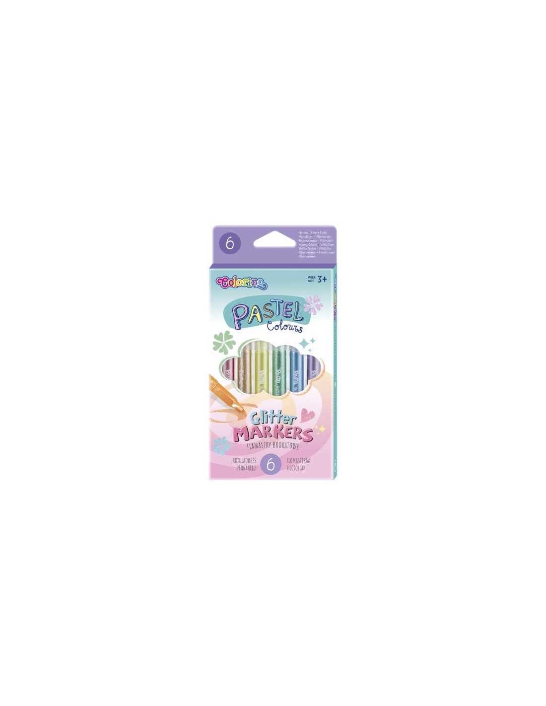Estuche de 6 rotuladorer con purpurina de colores diferentes en tonos pastel. Lavables. En caja de cartón. A partir de 3 años.