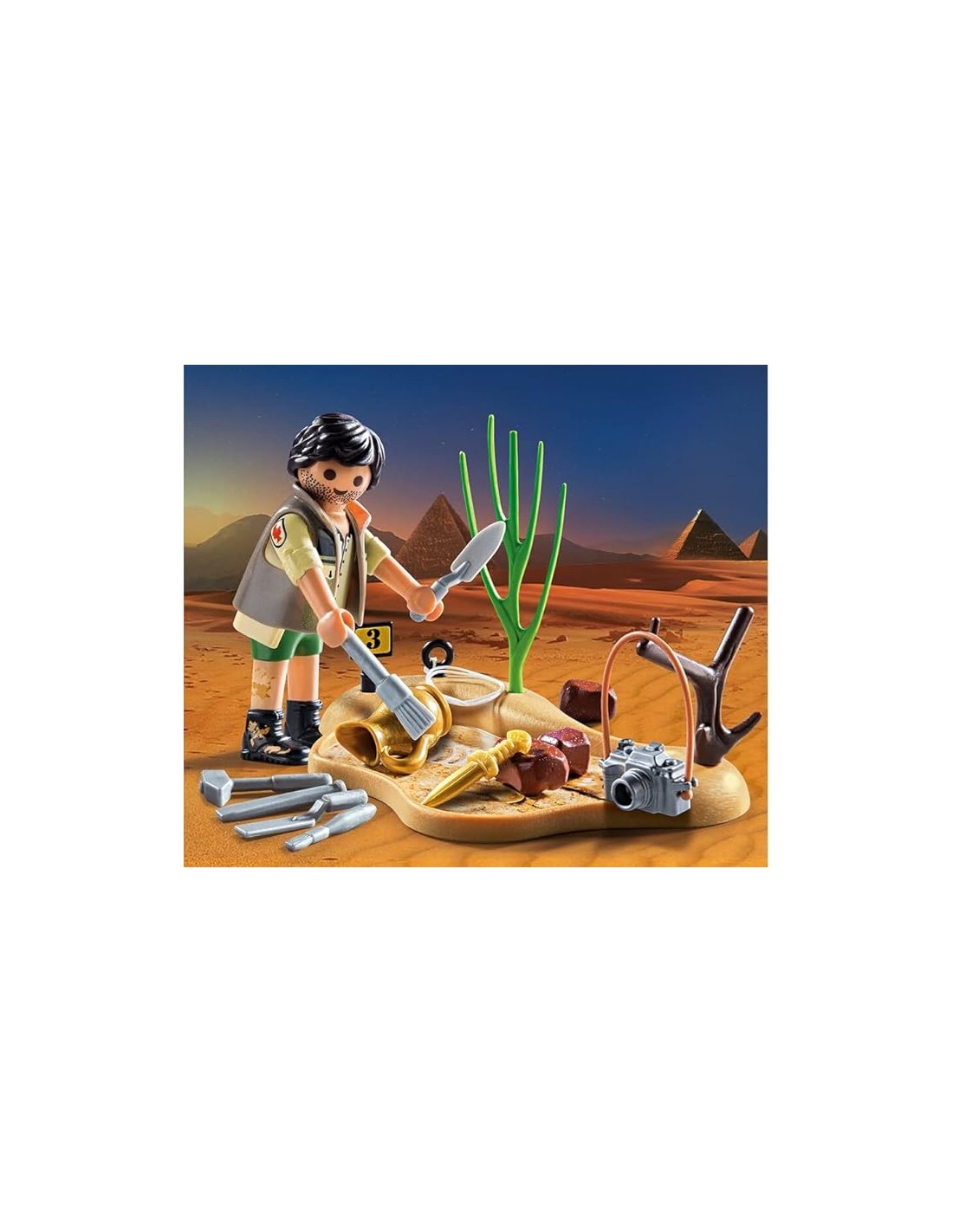 Set con una figura de arqueólogo con sus herramientas de trabajo, cámara de fotos, un parterre con hallazgos arqueológicos y pequeños accesorios. A partir de 4 años. Playmobil, 2018.