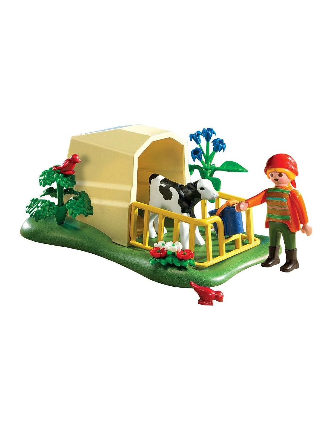 Incluye: El parterre con refúgio, 1 figura de cuidadora, 1 ternero, 2 pajaritos y 1 cubo.