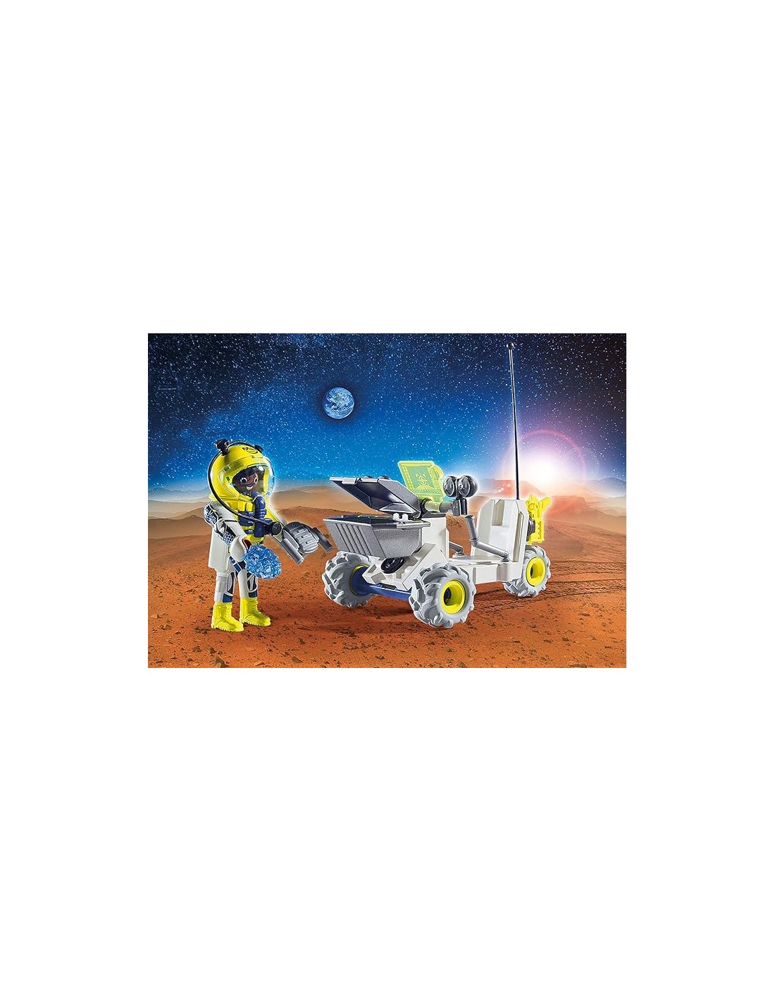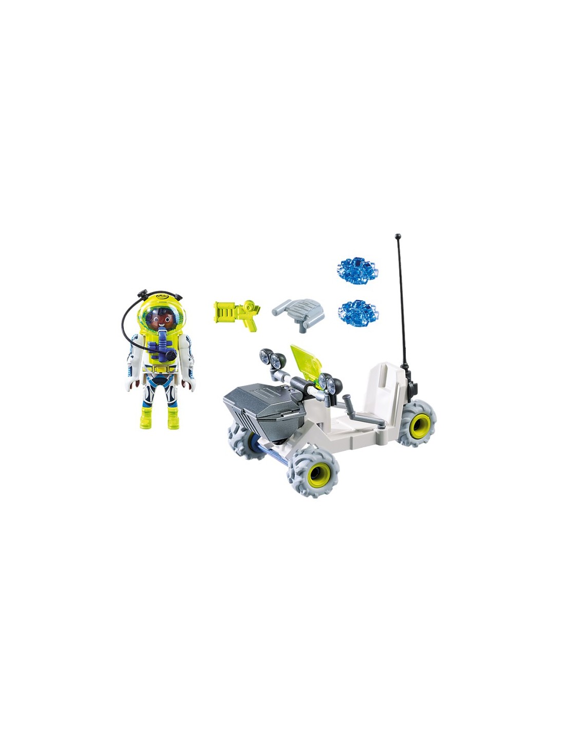 Incluye: 1 vehículo, 1 piloto totalmente equipado con traje espacial y pequeños complementos.