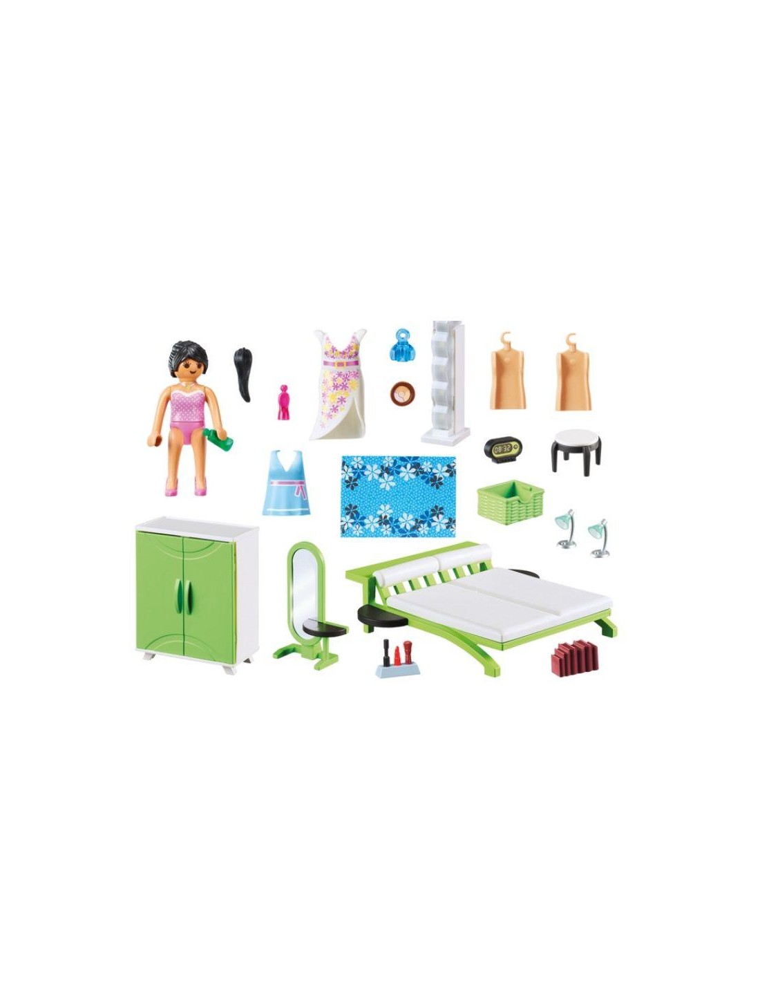 Incluye una cama doble con mesitas y cabecera que funciona como balda, armario de dos puertas, espejo de pié con mesita, torre de luz que funciona de verdad y muchos pequeños complementos. También incluye una figura de mujer en ropa interior y dos vestidos.
