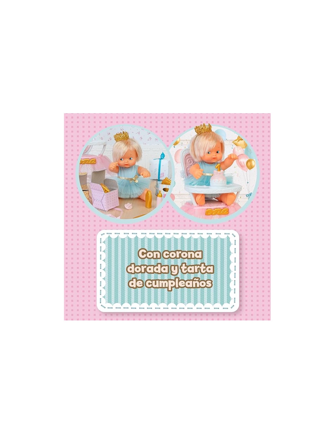 Incluye una muñeca Barriguitas exclusiva con pelo rubio, vestida con un traje de fiesta azul celeste y una coronita en la cabeza.