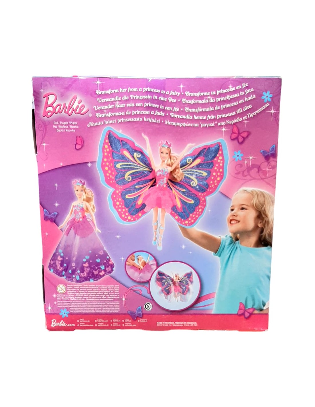 Acciona la palanca de su espalda para transformar las alas en una preciosa falda larga y ¡transforma a Barbie de hada a princesa!