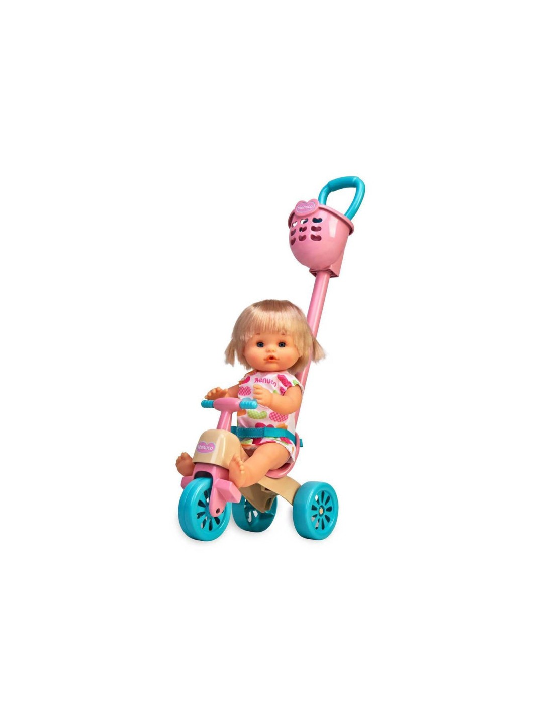 Este adorable set incluye una muñeca Nenuco rubia peinada con dos coletas,con un bonito vestidito y un triciclo de diseño colorido en rosa, amarillo y azul.