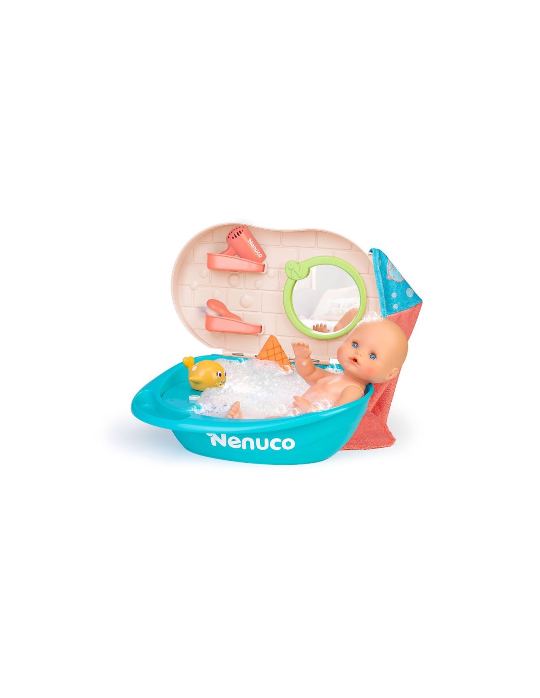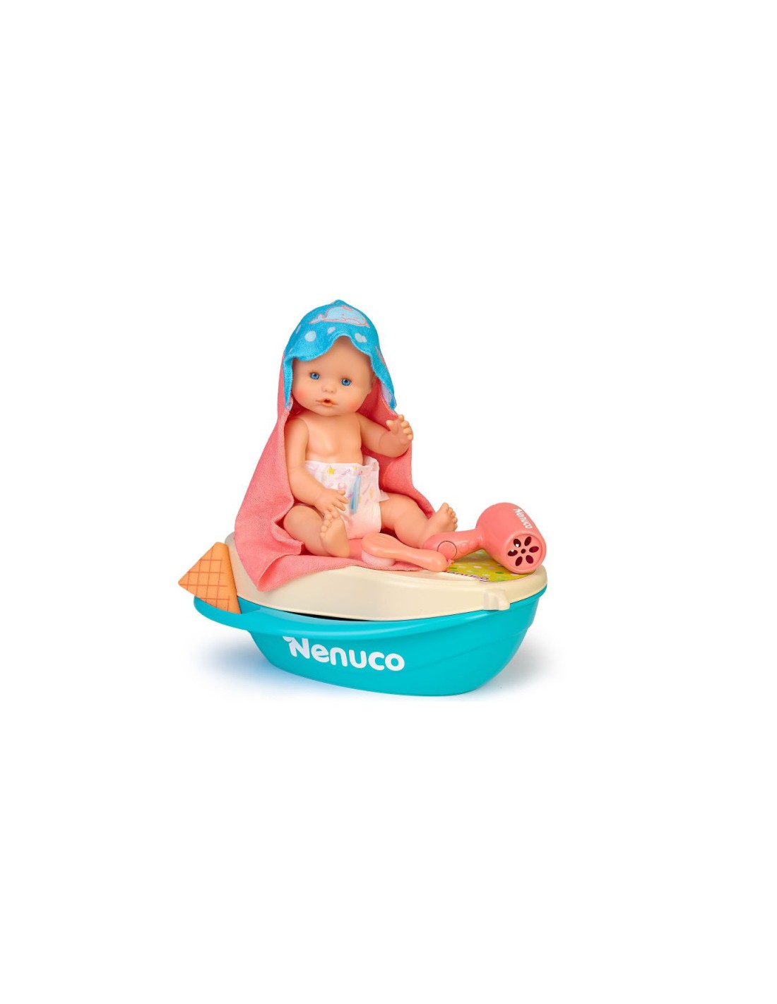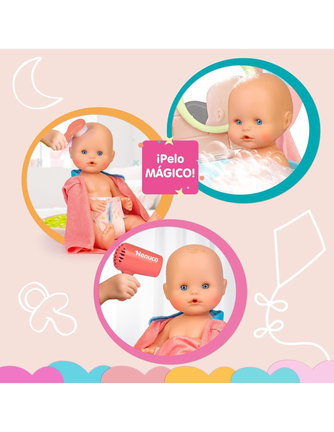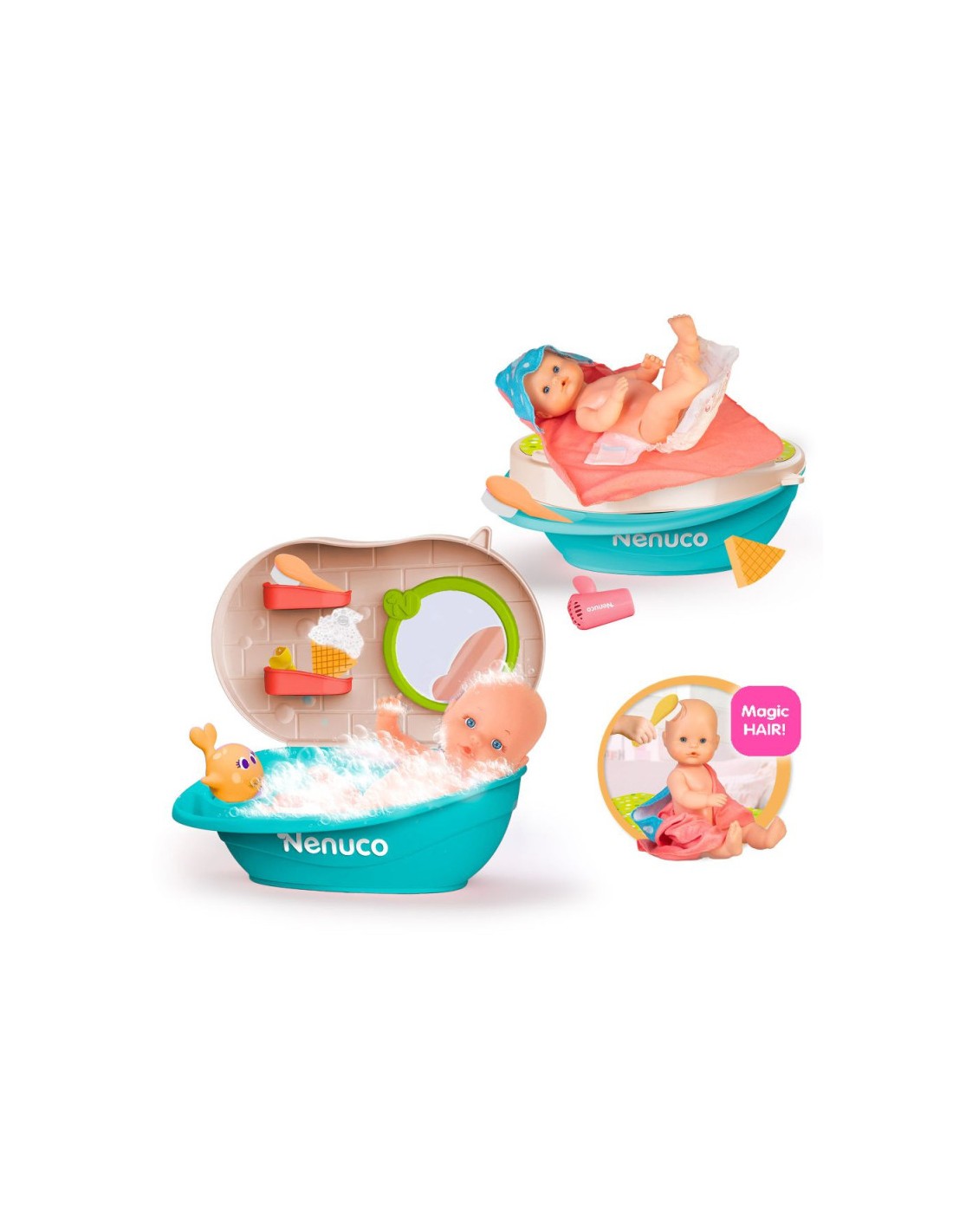Después del baño, envuelve a Nenuco en su tierna toalla con capucha y transforma la bañera en un práctico cambiador. Así, podrás ponerle el pañal, aplicarle cremita y peinarlo cómodamente en un solo lugar.