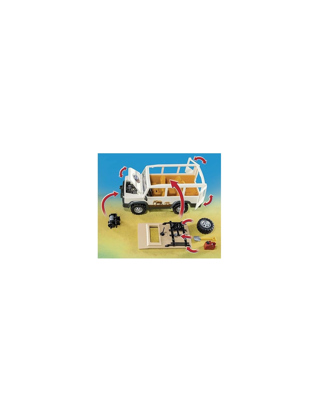 Vehículo todo terreno con techo extraible y cabrestante. Incluye dos figuras, dos leones, un árbol, herramientas y varios accesorios. A partir de 4 años. Playmobil, 2015.